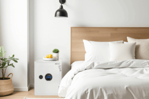 ORBシリーズはホワイトカラーで、テンキー操作部とハンドルはブラックといったコントラストが美しく、テンキー操作時は目に優しく見やすいブルーのバックライトが点灯し、空間と調和した洗練された佇まいの小型耐火耐水金庫です。